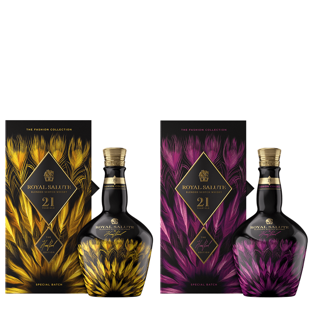 本組合內含皇家禮炮21年新奢時尚系列第三代「燦金羽冠」與「耀紫羽冠」限定版各1瓶