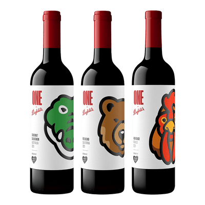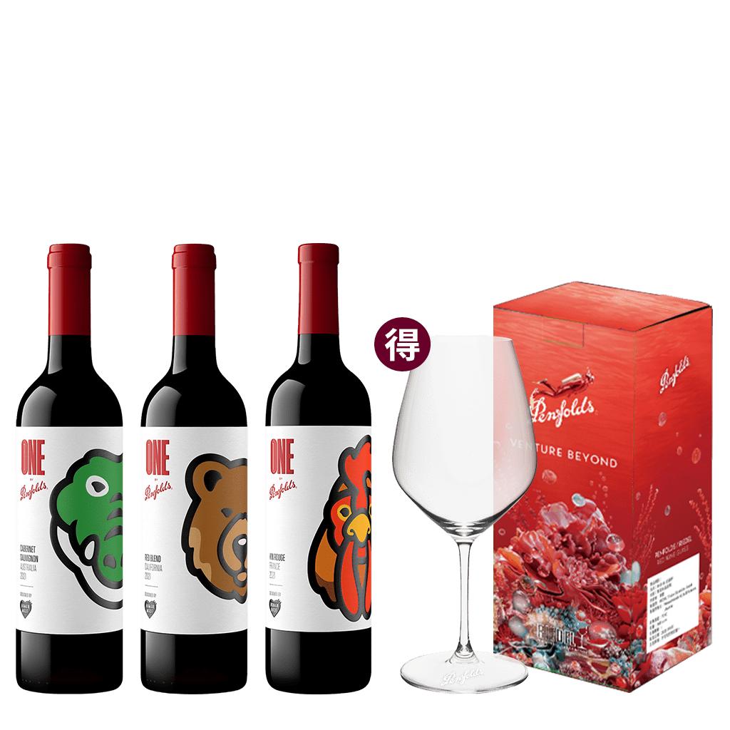 套組內含:ONE by Penfolds 澳洲系列卡本內蘇維翁紅酒(鱷魚)、法國系列法國混釀紅酒(公雞)、美國系列加州混釀紅酒(棕熊),3款各1瓶。